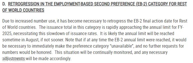 待新财年(2026财年)于2025年10月1日开始后,年度配额将重新设定,使领馆可恢复向符合条件的申请人签发EB-2类别移民签证。