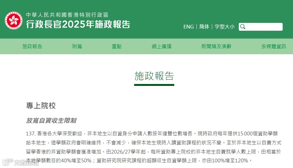 自2026/27学年起,每所资助专上院校录取非本地自费学生的上限,将由相当于本地学额数目的40%提升至50%;同时,资助研究院研究课程的超额收生自资学额上限,也将由100%上调至120%。