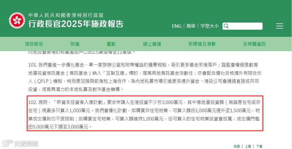 如购买住宅物业,计入投资额上限依旧为1,000万,但可算入的住宅物业投资会放宽,成交价门槛由5,000万元下调至3,000万元。