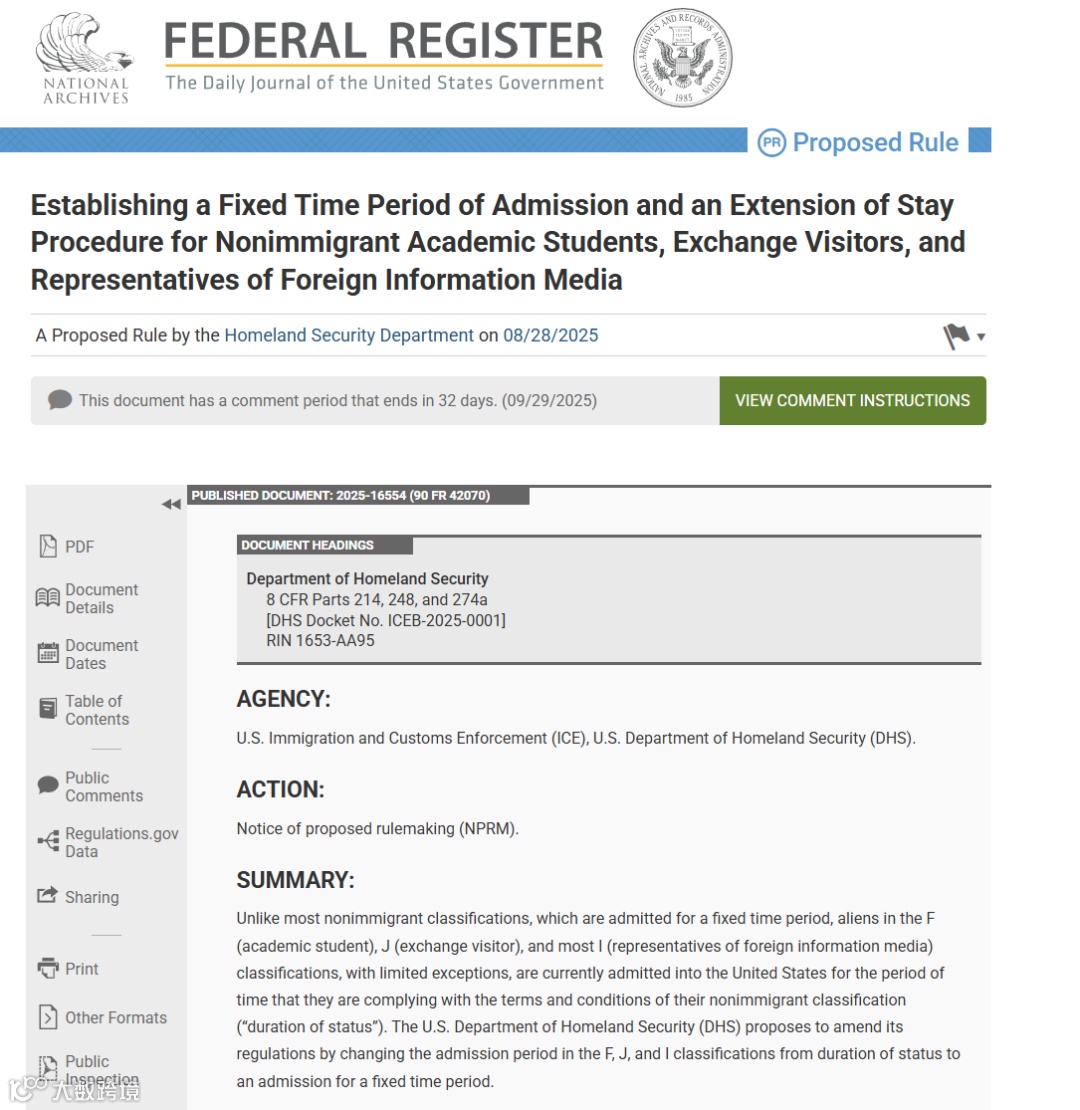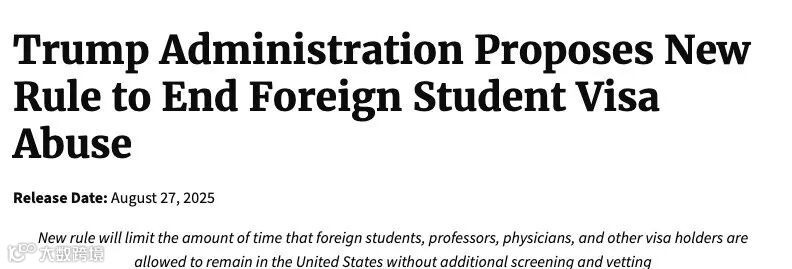 8月28日,美国国土安全部在《联邦公告》中发布了一项拟议新规,计划结束长期沿用的“身份有效期”制度,转而为学生签证、交流访问签证及媒体签证设定固定入境期限。