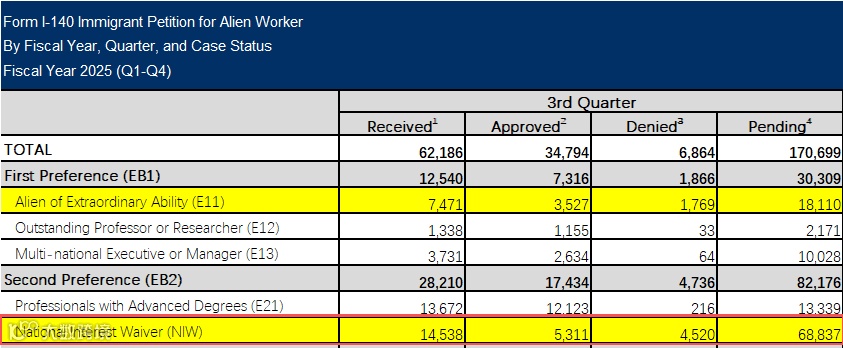 在2025财政年度的第三季度,移民局共接收NIW移民申请14,538份,其中5,311份顺利获批,4,520份被拒签,另有68,837份申请尚在等待审理进程中。