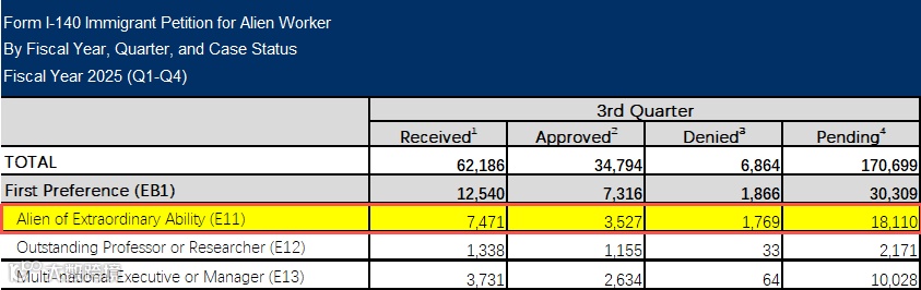 在2025财年的第三季度,EB-1A类别共计收到7,471份申请,审批通过了3,527份,拒签1,769份,等待审理18,110 份。