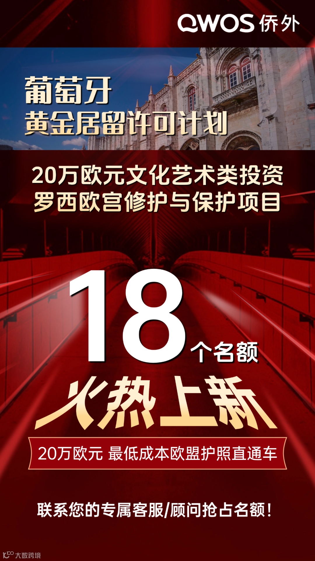 罗西欧宫修复与保护项目,共计仅有18个黄金居留名额。仅需低成本投入,便能成功锁定欧盟身份,享受欧盟诸多福利。机会转瞬即逝,不容错过,赶快行动起来,抓住这难得的契机,开启您的欧盟身份之旅。