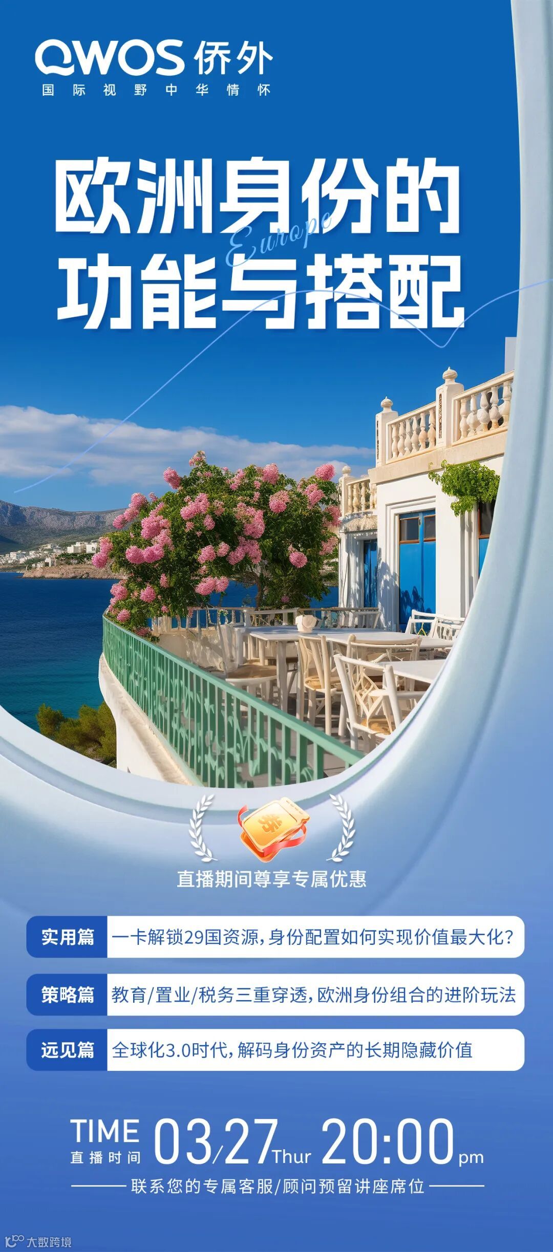 对欧洲移民感兴趣的朋友,也欢迎参加侨外出国3月27日举办的“欧洲身份的功能与搭配”讲座活动,侨外资深葡萄牙移民专家将为您详解“欧洲身份配置如何实现价值最大化?”,也将为您分析欧洲身份组合的进阶玩法。讲座为闭门形式,想参与的朋友,请尽快联系我们报名参加吧!
