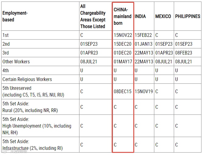 对于中国大陆地区出生的申请人来说,EB-1从2023年1月开始双表出现排期,这之后排期走走停停的,7月EB-1的表A排期终于动了7天,但8月EB-1表A排期继续停留在2022年11月15日,表B停留在2023年1月1日无变化。