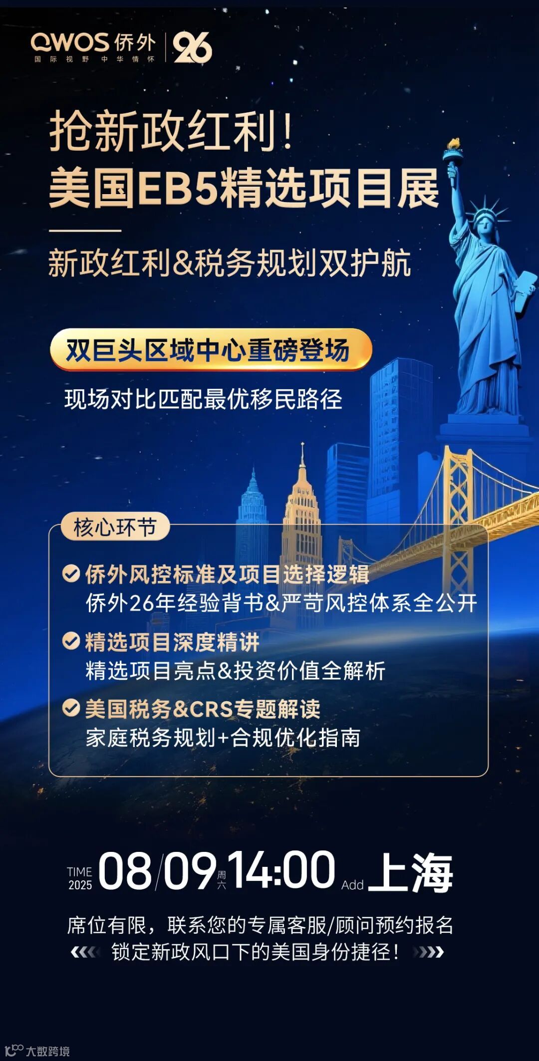 8月9日,上海侨外举办的“抢新政红利!美国EB5精选项目展”活动将重磅开启,专家将深入剖析美国EB5移民新政,帮助您抢占政策风口,快速获取美国身份。两大权威区域中心同台,为您提供优质EB-5项目↓