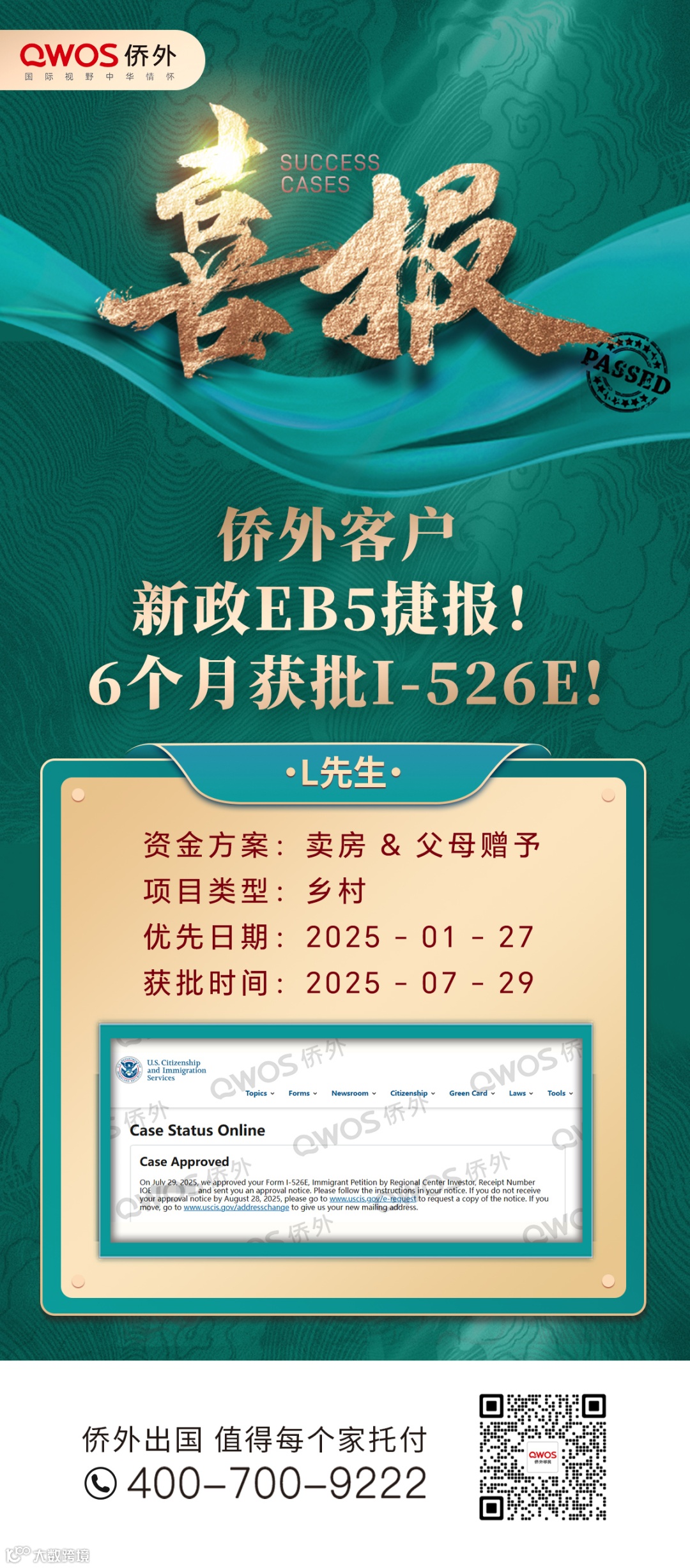 同日之内,L先生一家也传来捷报,通过父母赠与+卖房资金规划,实现6个月一步到位无补件获批I-526E。这也印证了侨外团队对复杂资金来源的处理实力。