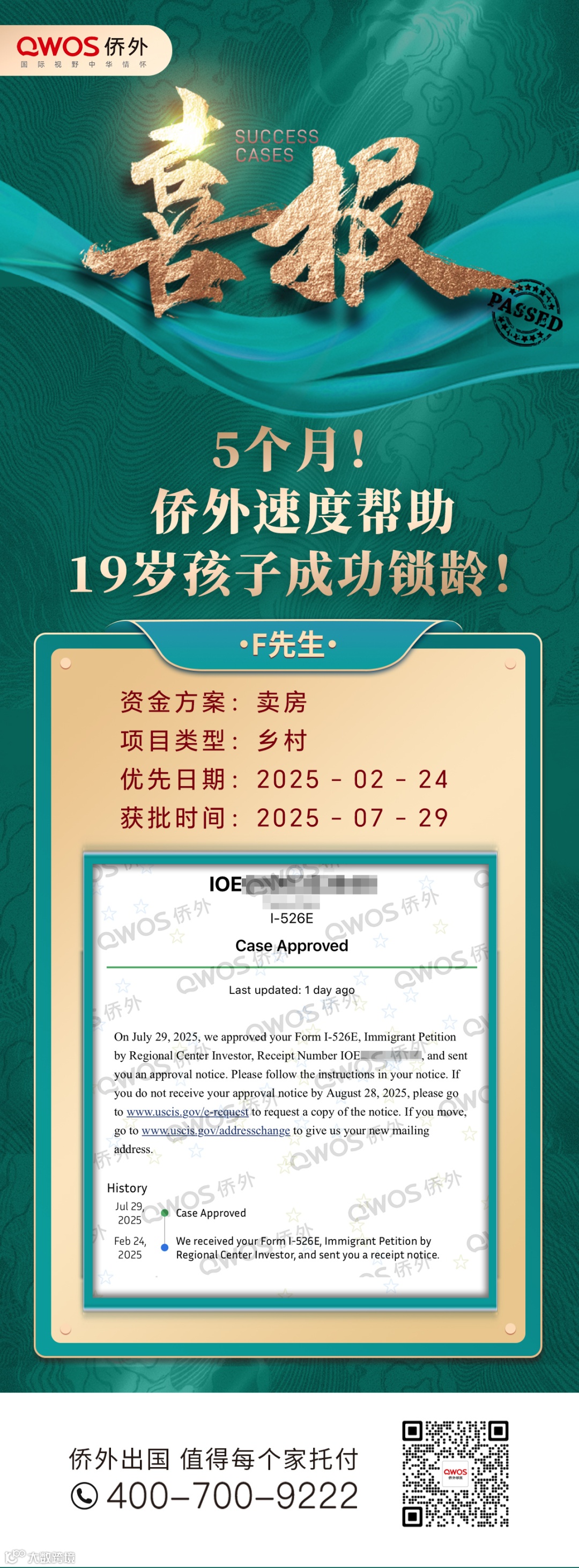 近日,一位年仅19岁的副申请人凭借侨外精准规划,成功锁龄,仅耗时5个月便顺利获批I-526E!侨外团队通过专业实力与高效执行力,助力孩子抢在排期浪潮前稳稳“上车”,未来无忧。