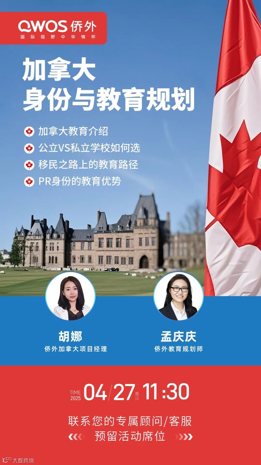 对加拿大身份和教育规划感兴趣的小伙伴,也欢迎参加侨外4月27日的“加拿大身份与教育规划”活动,加拿大移民与教育专家将围绕“加拿大留学路径深剖”、“身份规划全攻略”两大核心议题,为您抽丝剥茧、答疑解惑,揭秘“如何通过移民实现教育资源的跨越式升级”。名额有限,快联系您的专属顾问报名参加吧!