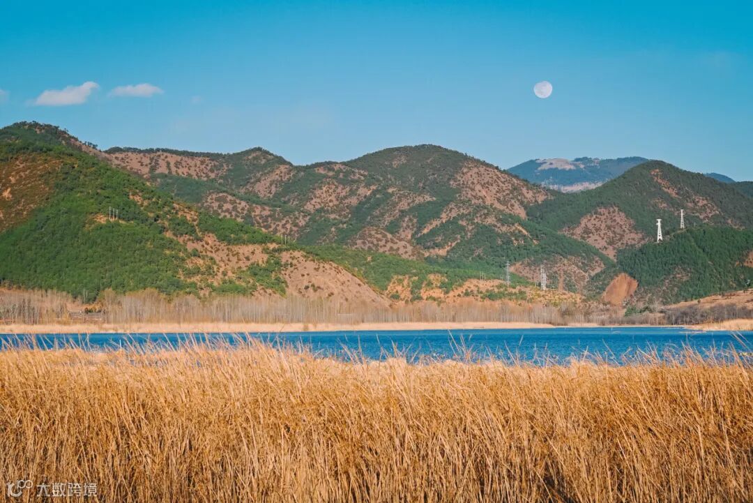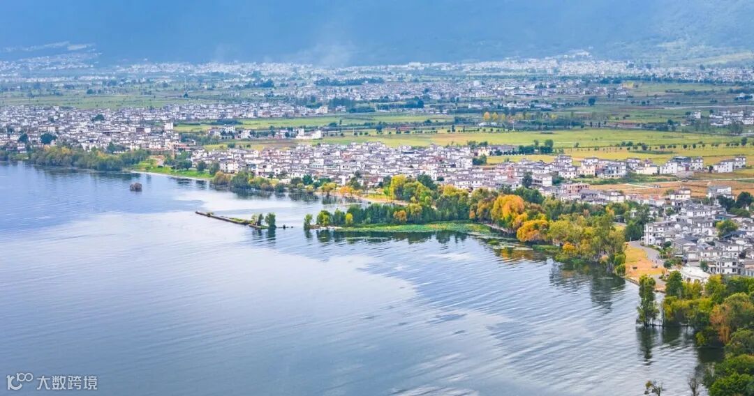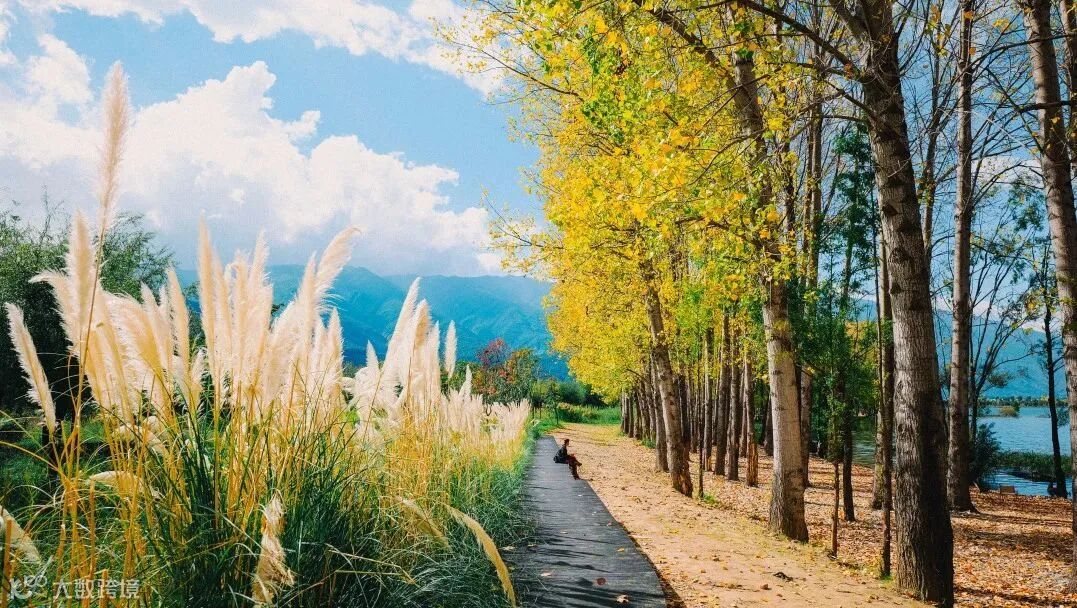 深秋的大理洱海生态廊道明媚如初,白色的芦苇在秋风的吹拂下摇曳生姿,与湛蓝的洱海、金色的稻田、金黄的银杏相互交织,构成了一幅宁静而又自由的山水画卷。