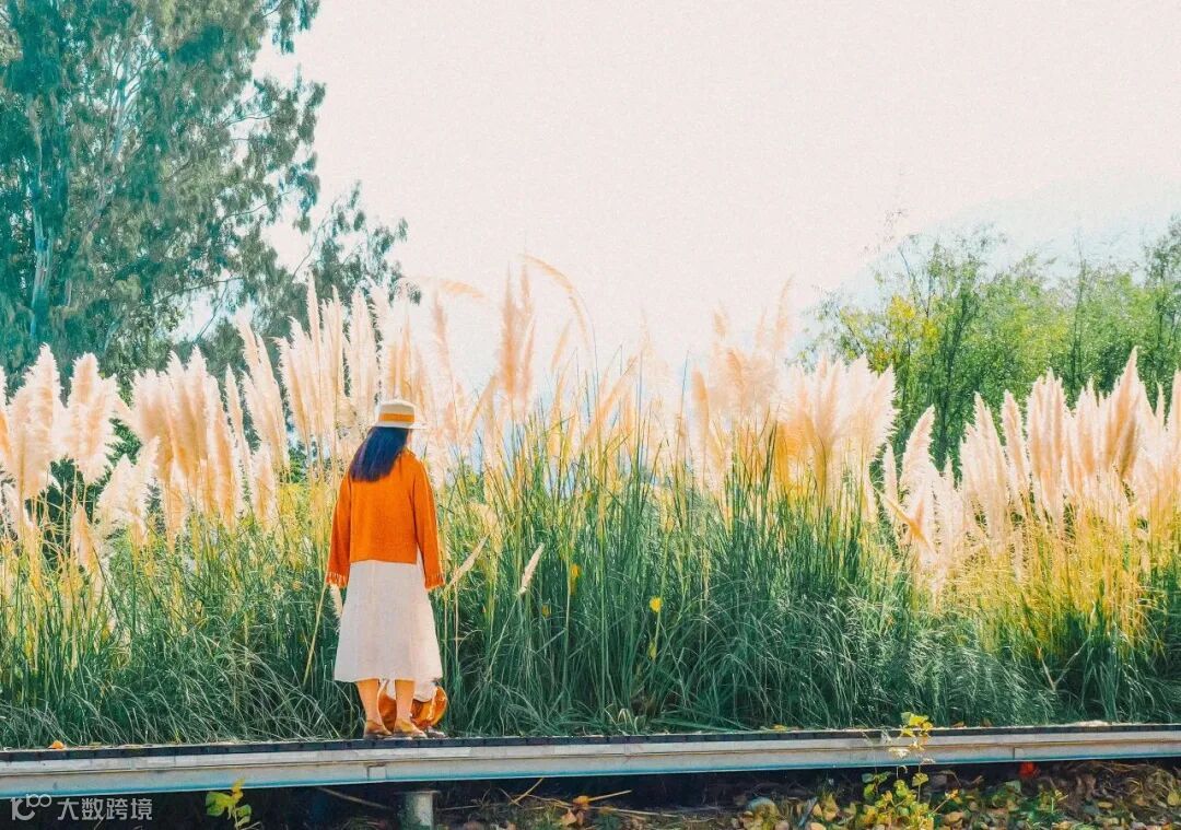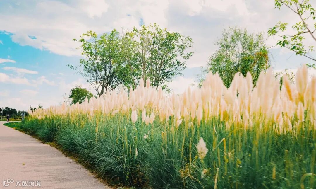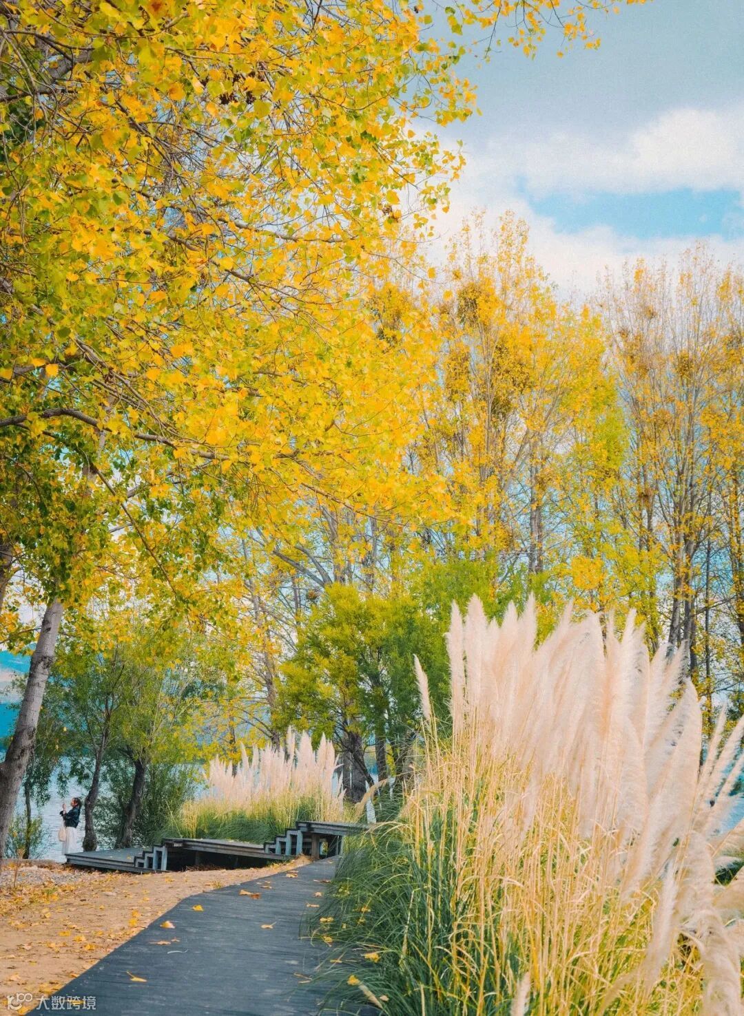 白色的芦苇盛开在蓝、绿、黄交织的廊道,仿佛开启调色模式,美得突出。