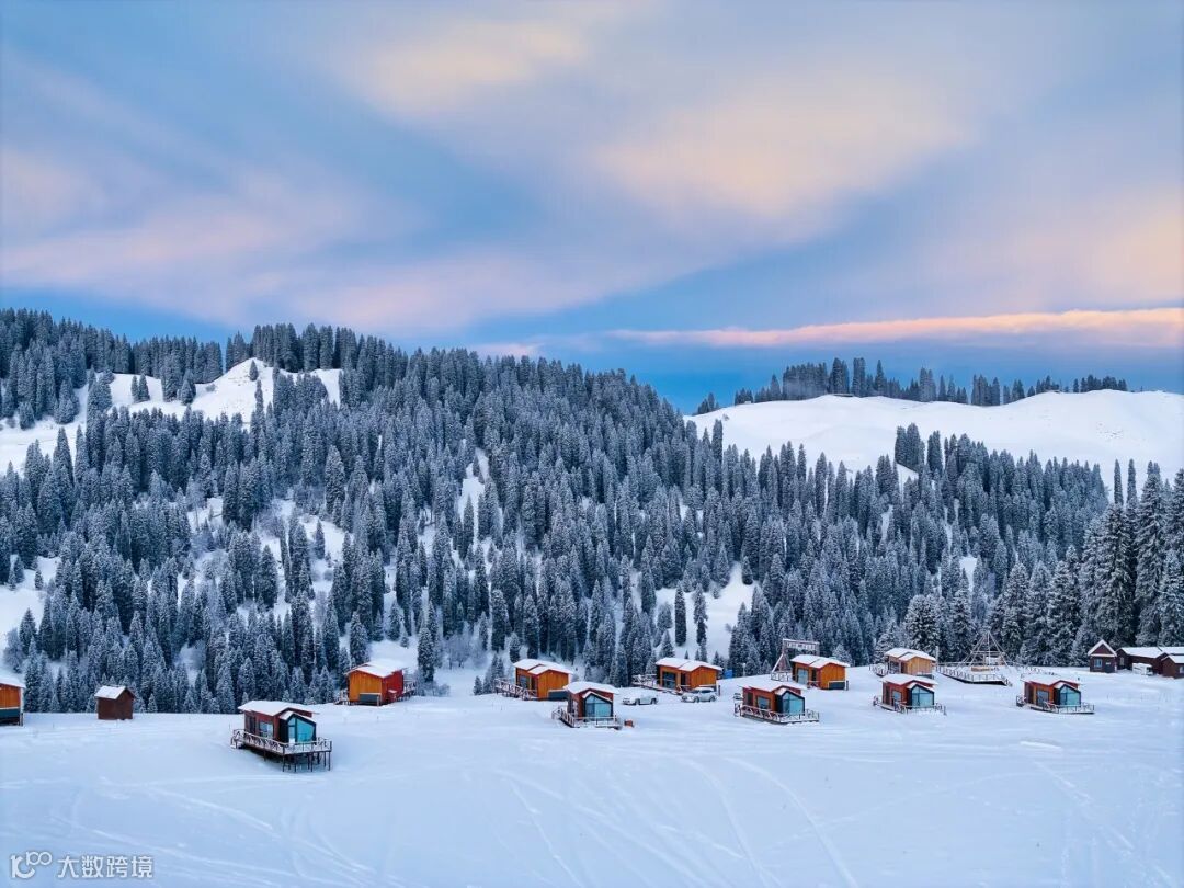 风起时,雪花飞舞,落雪跳动在林间,晶莹的白雪、温暖的木屋、沉睡的森林交织在一起,宛若一幅水墨画。