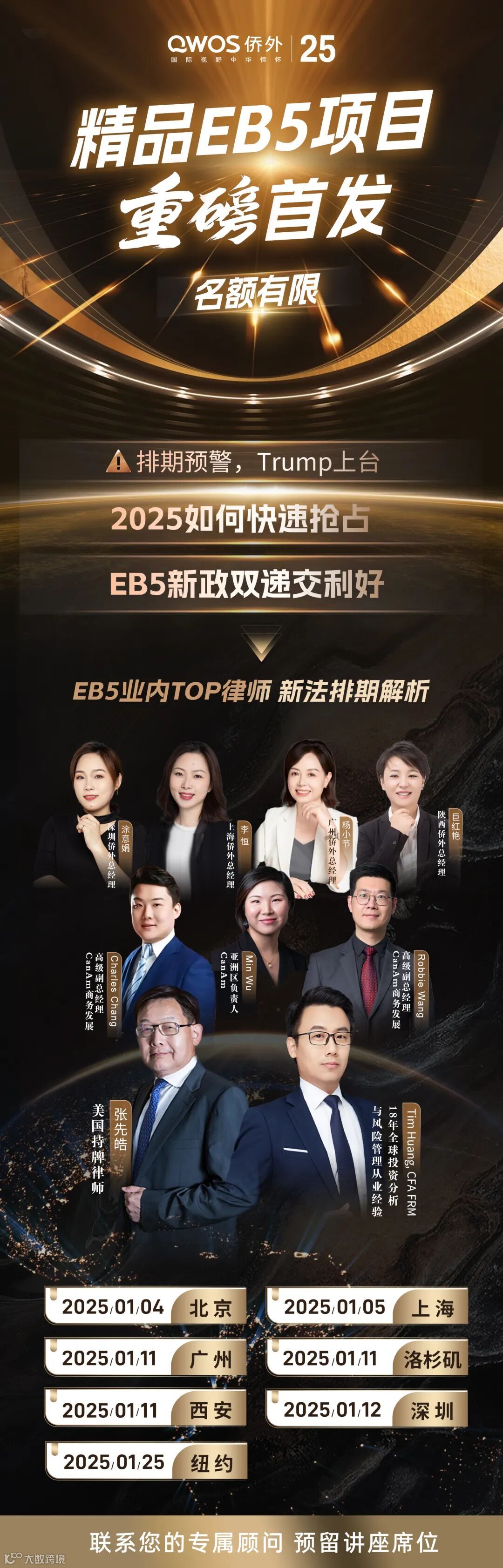 为了帮助大家把握目前预留签证无排期的最后窗口,深耕美国移民20多年的侨外出国,特别策划了“2025如何快速抢占EB-5新政双递交利好?”大型全球巡回讲座活动。