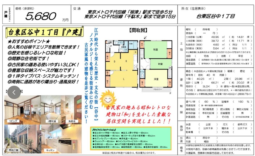 这座房产位于东京台东区谷中1丁目,价格(不含税)为5,680万日元,折合人民币约为267万。其地理位置优越,距离东京地铁千代田线的“根津”站仅需步行5分钟,距离“千駄木”站也仅需步行15分钟。