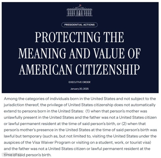 该行政令将在发布30天后(2025年2月19日)生效,这一消息瞬间激起了广泛讨论与反响。毕竟之前大家以为这项政策只针对“无证移民”,然而令人意外的是,范围扩大到了合法的临时居住人群——即H-1B/L-1/O-1等工签家庭、F-1/M-1/J-1留学生访学家庭、B-2旅游签家庭等等。