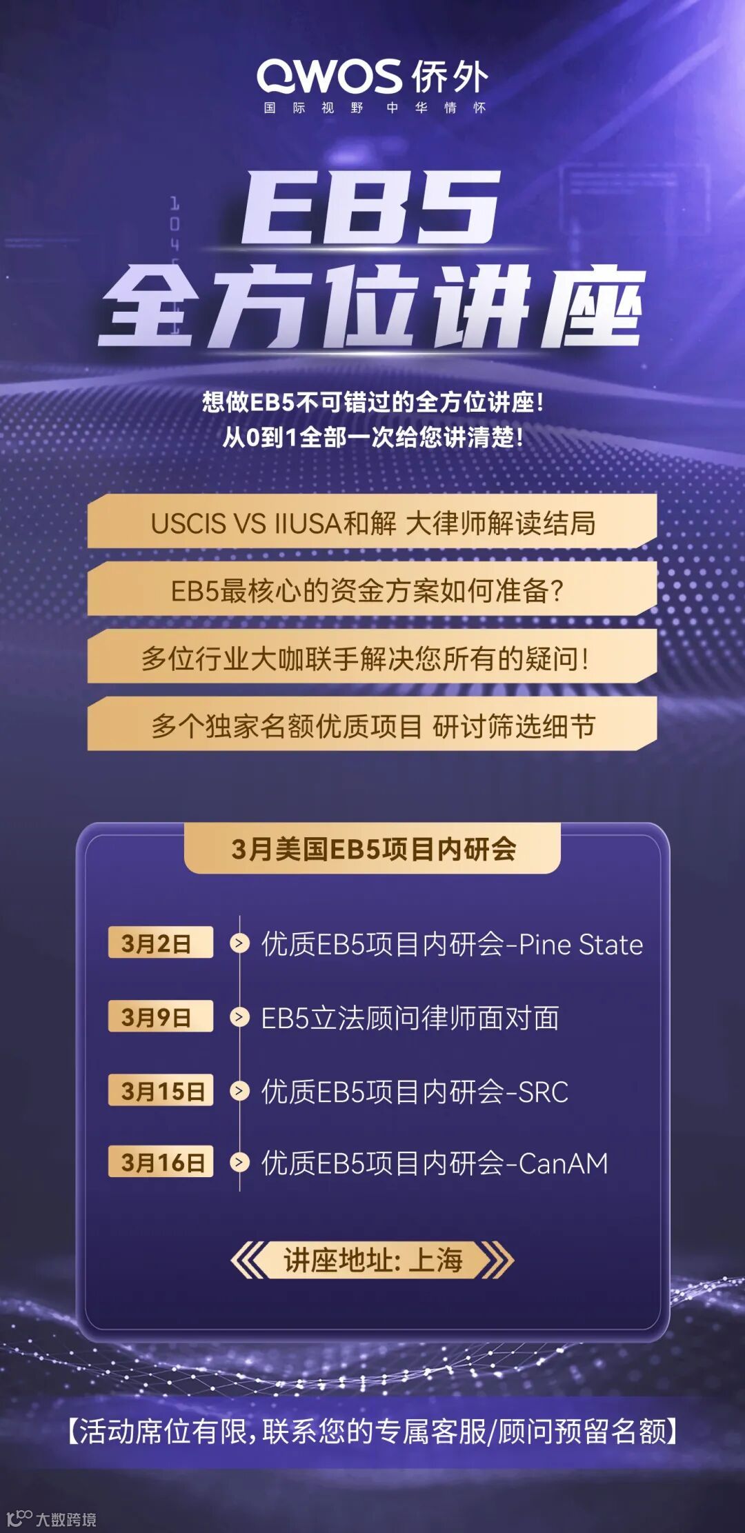 想了解更多相关信息的朋友,欢迎参加3月上海美国活动月,EB-5全方位讲座:多位权威专家见面会”活动。活动现场,我们将邀请多家优质区域中心同台PK,为投资者带来极具竞争力的优质项目。