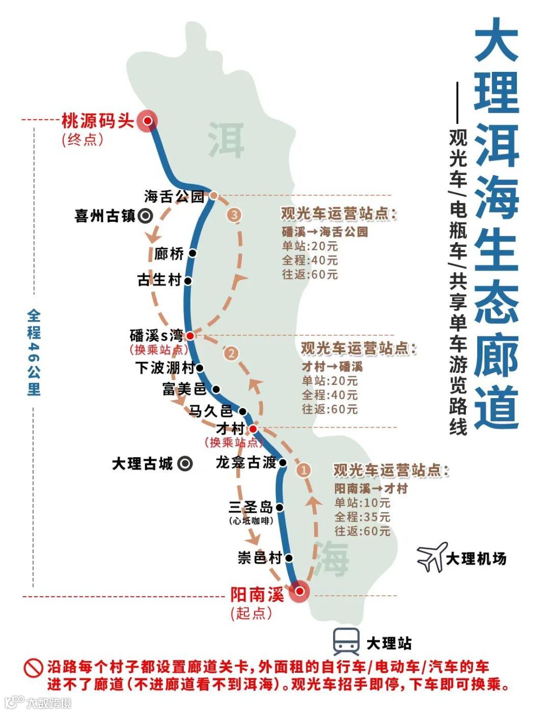 阳南溪(廊道起点)→桃源码头(廊道终点)46km是海西生态廊道,沿路每个村子都设置廊道关卡,外面租的自行车/电动车/汽车的车进不了廊道。建议:可直接打车到沿途村子进廊道内骑行或坐观光车游玩。