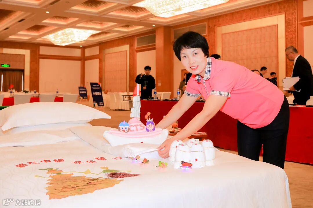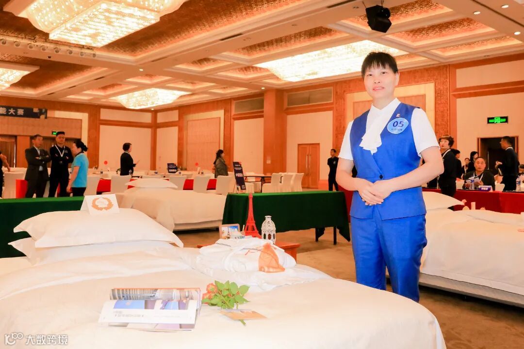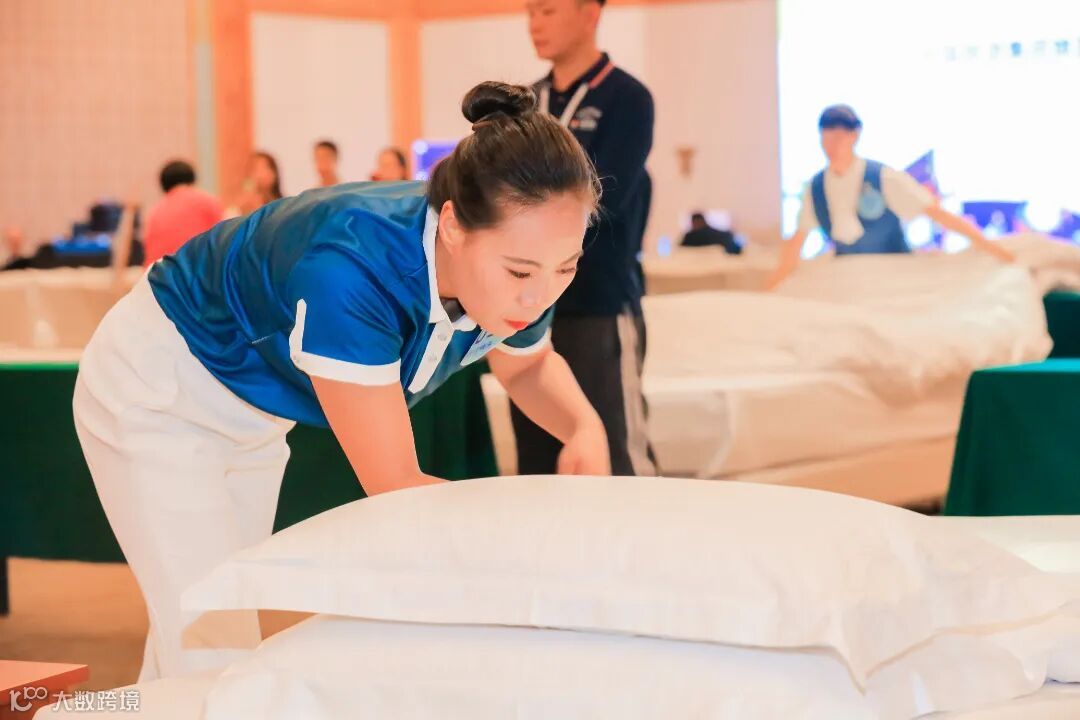 甩单、包角,一气呵成,不到3分钟竟可铺好一张整洁的客床,床单中线、枕头的摆放位置、包角的角度,刻度精准到毫米。