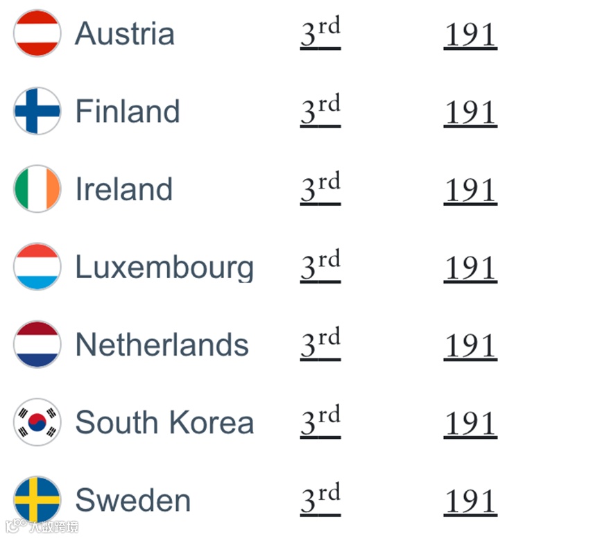 爱尔兰、瑞典、芬兰、奥地利、韩国、卢森堡和荷兰的护照排名第三,免签 191 个目的地。
