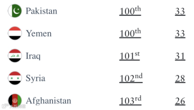 那么,在今年的榜单中,哪些国家表现最差呢?位居榜尾的三个国家分别是阿富汗、叙利亚和伊拉克。