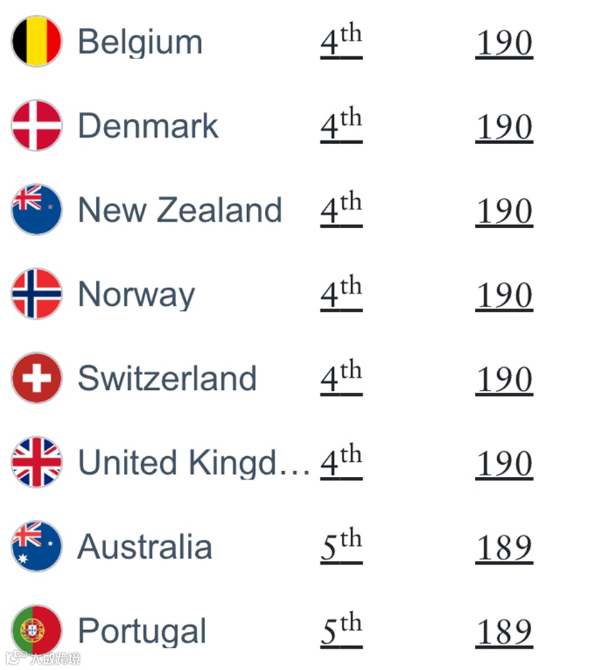 英国则与新西兰、挪威、比利时、丹麦和瑞士并列第四,免签 190 个目的地。澳大利亚和葡萄牙位列第五。