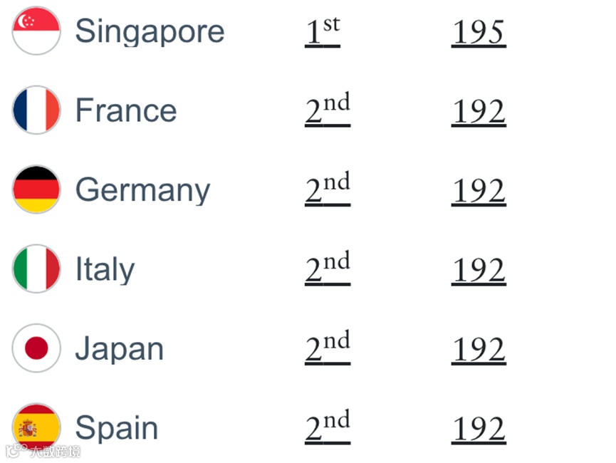 在今年的最新排名中,紧随新加坡之后的,是日本、德国、法国、意大利和西班牙护照,这些国家并列第二,免签192个目的地。