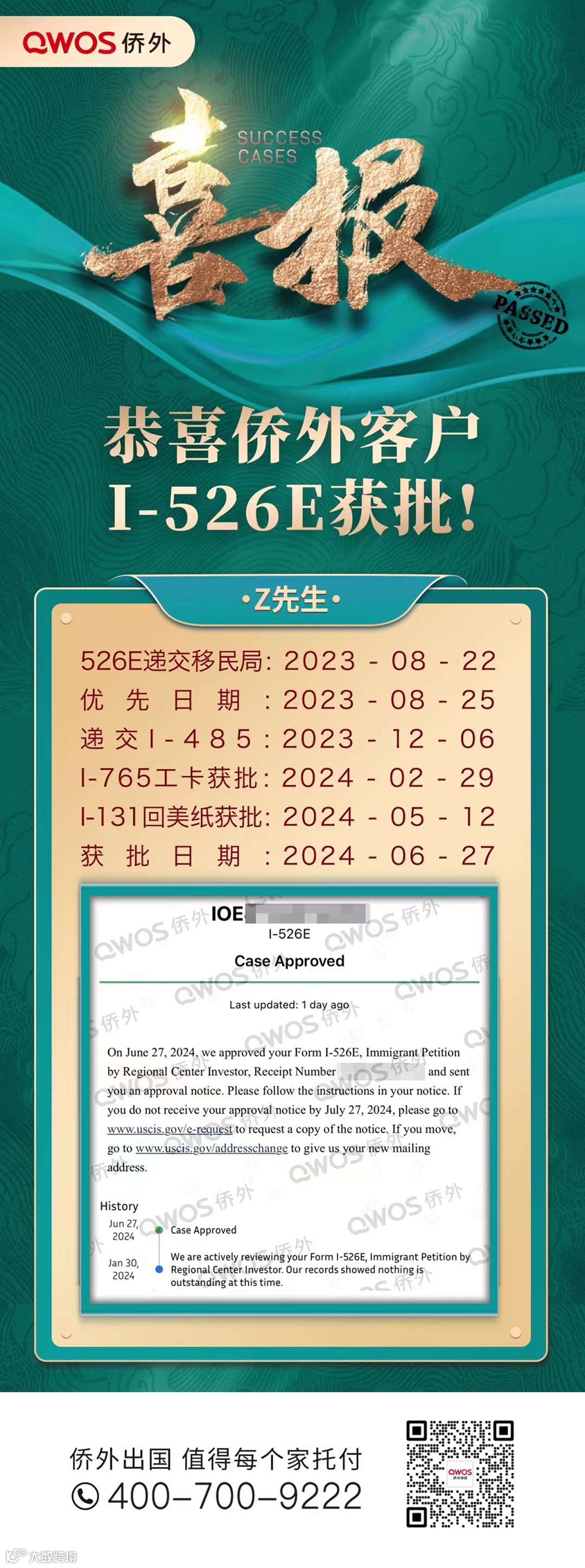 过去一周,对多位侨外EB-5投资者来说,是充满喜悦的一周,他们迎来了 I-526E 获批的好消息!