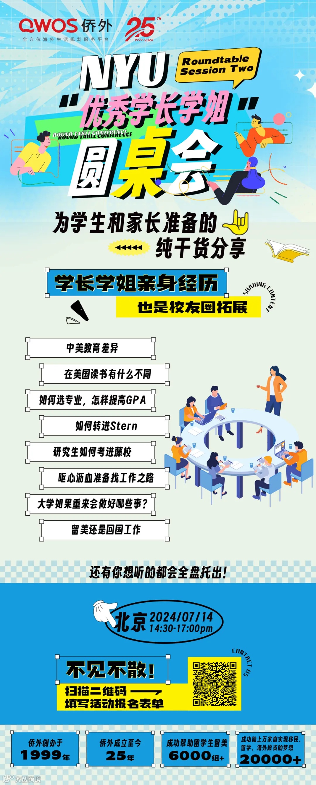 侨外出国也将于7月14日在北京举办“纽约大学精英学子圆桌会”活动,为大家提供一个线下交流与交友的机遇,特邀多位纽约大学毕业的杰出学子们,分享他们在美国生活、学习、申研以及求职等方面的宝贵经验。干货满满,不容错过,有兴趣的朋友,快联系您的侨外客服、顾问报名参加吧!