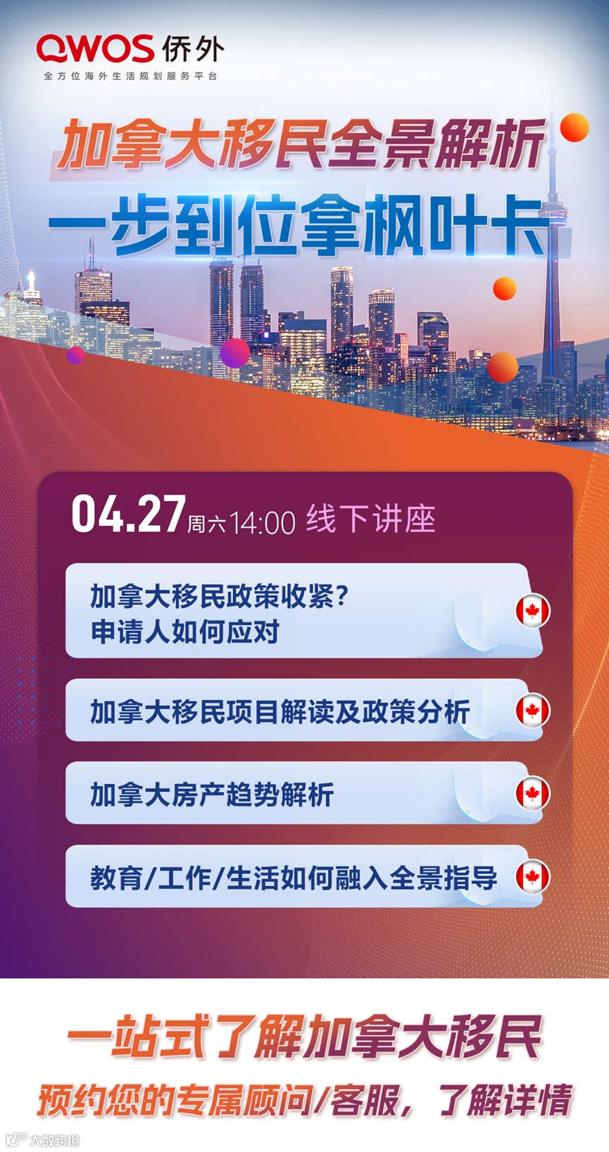 4月27日本周六,侨外出国将举办“加拿大移民全景解析”线下活动,特邀加拿大移民专家为大家全面解读加拿大移民、生活、工作、教育、置业等问题。干货满满,不容错过。感兴趣的朋友,欢迎咨询您的专属顾问、客服报名参加!名额有限,先到先得!