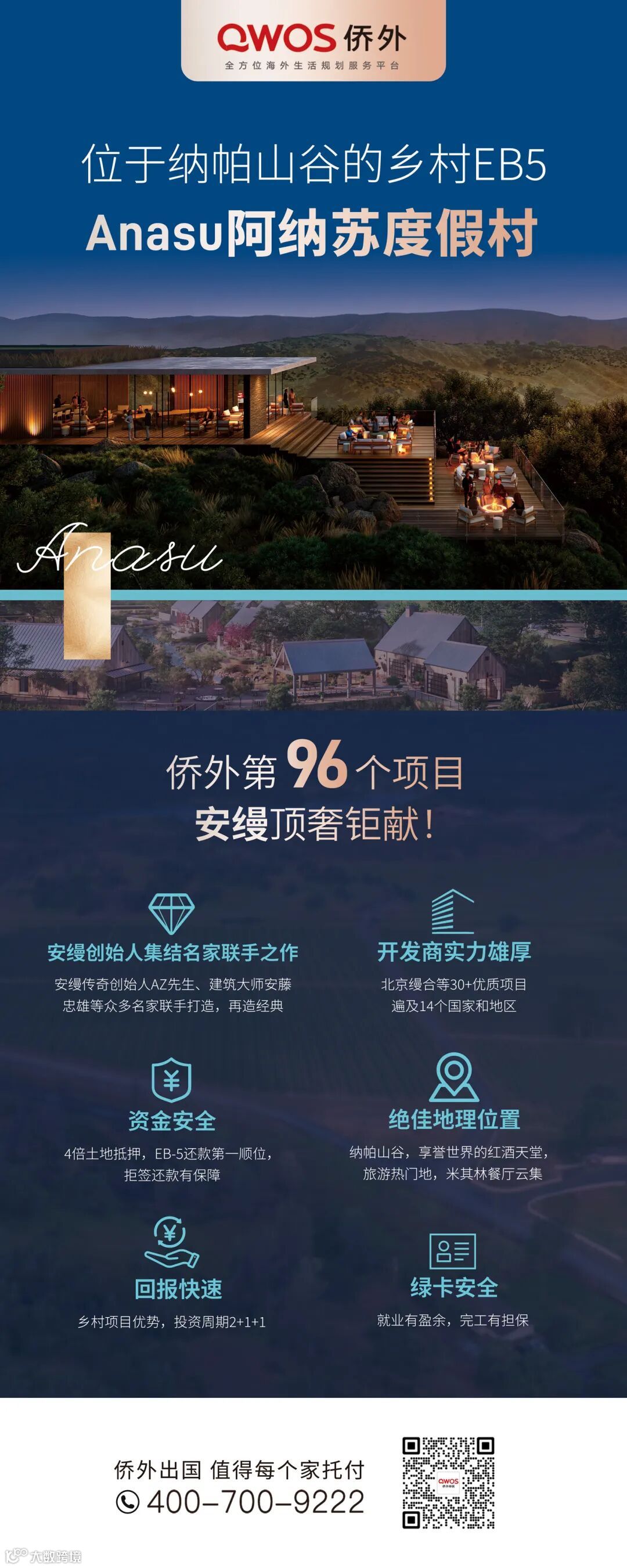 为此,侨外出国为投资者们甄选了位于北美绝佳度假目的地——加州葡萄酒产区的EB-5精品乡村地区酒店项目“阿纳苏度假村”。那么,这个项目究竟有何“亮眼之处”呢?