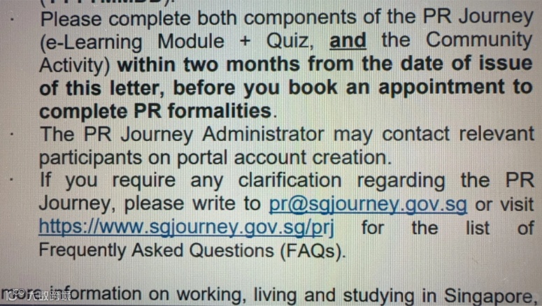 根据邮件要求,PR申请者需要在线上学习包括了解新加坡文化和本土生活方式、促进社会和谐的课程并通过考试(E-Learning Module + Quiz),并且参加完一系列的社区活动(the Community activity),才可以进一步完成PR formalities 手续。而整个学习和考试过程必须在PR批准的两个月内完成。