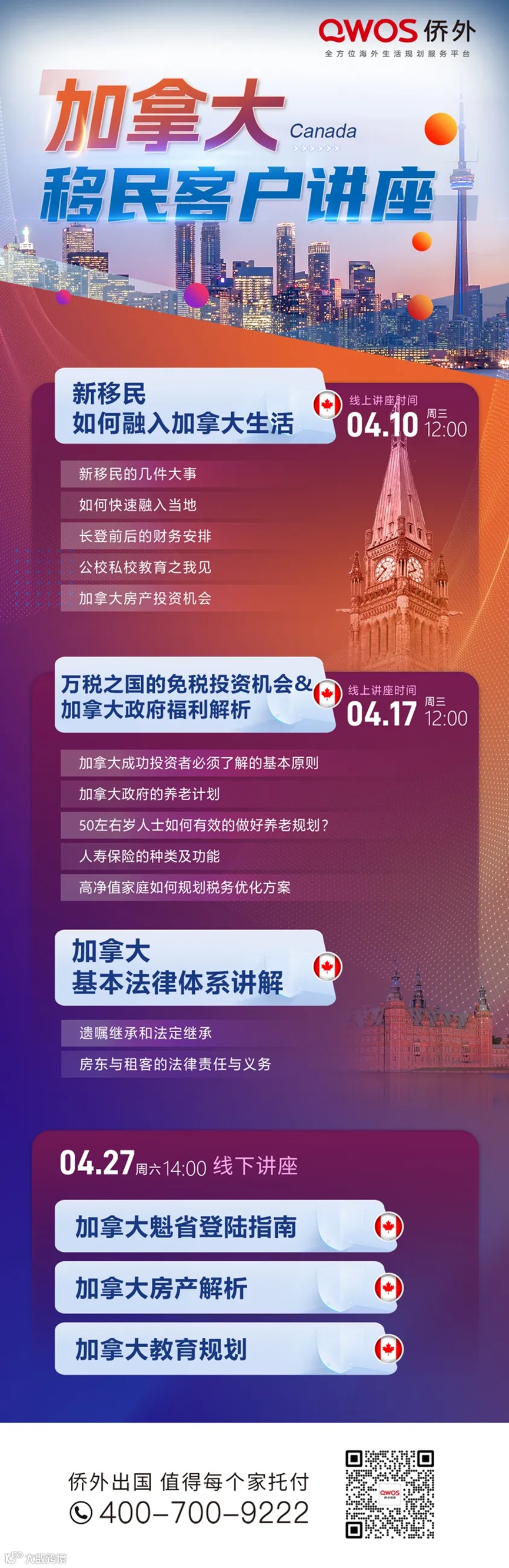 侨外出国也将于4月份举办加拿大系列讲座活动,内容丰富,精彩纷呈,绝对让您收获满满!有兴趣的朋友,扫描下方海报上的二维码,锁定预约名额↓↓↓