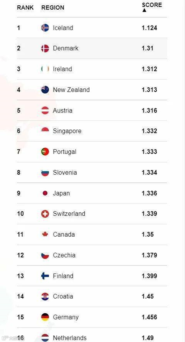 个席位,除了冰岛、丹麦和爱尔兰霸榜前三之外,奥地利、葡萄牙、斯洛文尼亚、瑞士也跻身十强。两个亚洲国家进入前