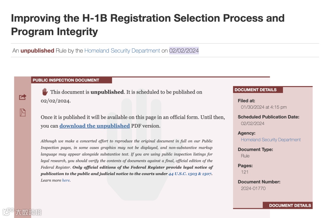 根据联邦公告网,这份改革方案将于2024年2月2日正式开始为期30天的公示。这也就意味着2024年3月3日开始,这份文案就会正式生效执行。同时意味着2024年这一轮抽签类H-1B申请将使用全新政策。