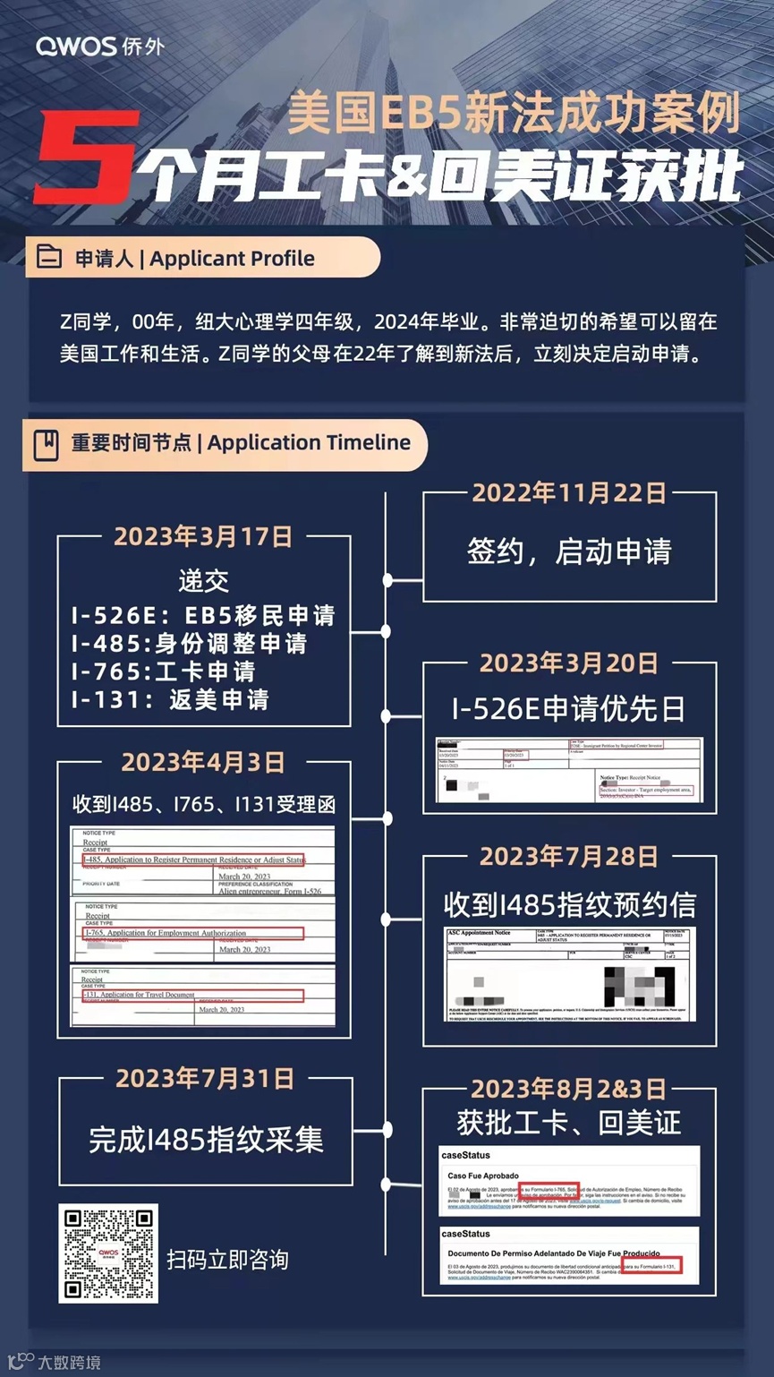 今年3月份,我们为Z先生的女儿递交了I-526E和I-485,同时递交了工卡和离境申请许可。7月底,Z先生女儿就收到了I-485的指纹预约信,8月初,她就成功收到了EAD工卡和回美证。这一切,耗时仅5个月!