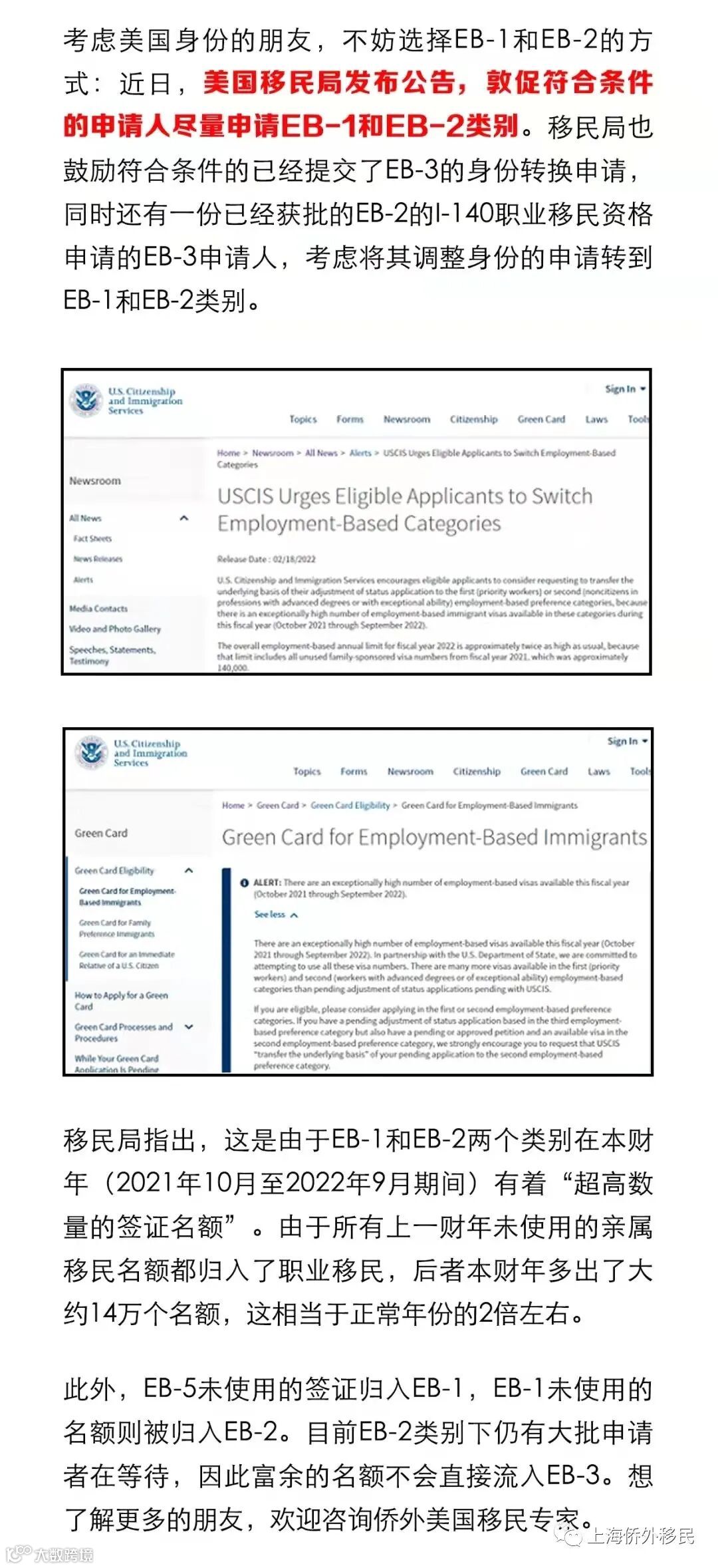 导读:近日,美国移民局发布公告,敦促符合条件的申请人尽量申请EB-1和EB-2类别。