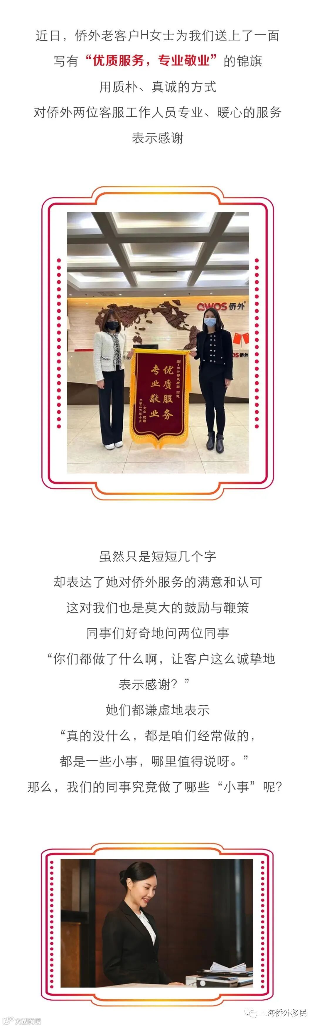 导读:近日,侨外老客户H女士为我们送上了一面写有“优质服务,专业敬业”的锦旗。