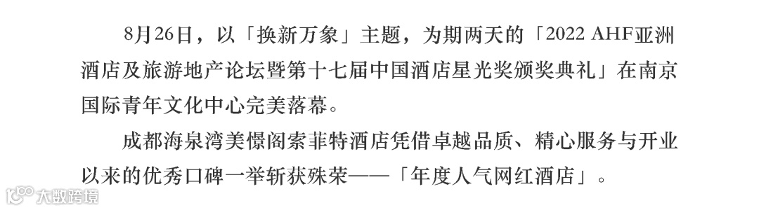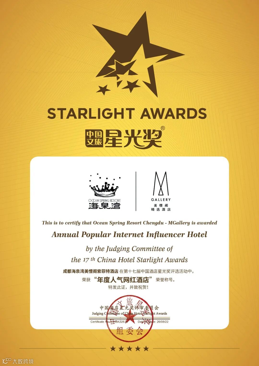 喜报|成都海泉湾美憬阁索菲特酒店荣获星光奖「年度人气网红酒店」