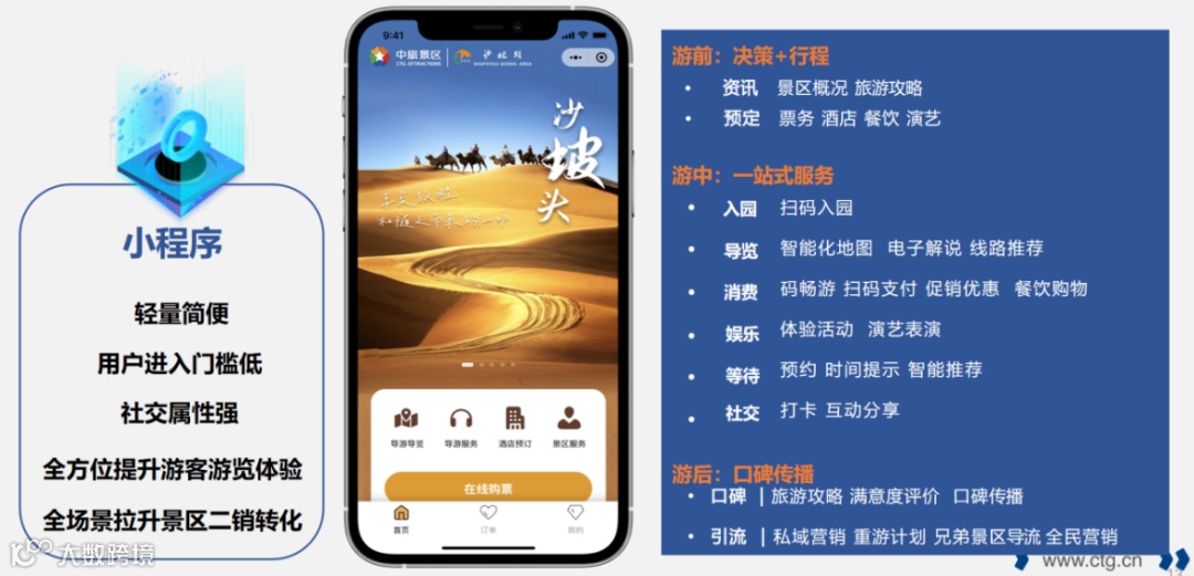 基于中旅国际数字化平台强大的供应链优势和资源整合能力,支持快速构建满足游客游前、游中、游后服务需求的游客端小程序,一年内,已赋能17家自有景区、上线20个官方微信小程序,为游客提供游前(资讯、预订)、游中(检票、导览、消费、娱乐、排队、社交)、游后(评价、攻略)一站式服务和体验。游客通过景区小程序可实现从查询、实名预订、支付购票、预约、人脸识别到二维码入园核销一站式完成,智慧化应用提升游客体验。