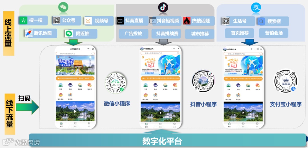 中旅国际结合行业发展需要、以用户为中心,打造一站式“旅游目的地数字化平台”,为景区提供前端应用、业务中台、数据中台、综合管控、辅助决策等能力,赋能景区数字化转型。一平台多系统解决了景区信息化基础设施落后、机房设施上云率低、数字营销整合能力欠缺、科技创新环节薄弱等问题,全面助力景区运营管理。同时,数字化平台链接旅游产业上下游生态合作伙伴,充分运用平台优势,实现与携程、美团、飞猪等头部OTA的系统直连,无论游客在什么渠道下单交易,均可凭借二维码核销入园。