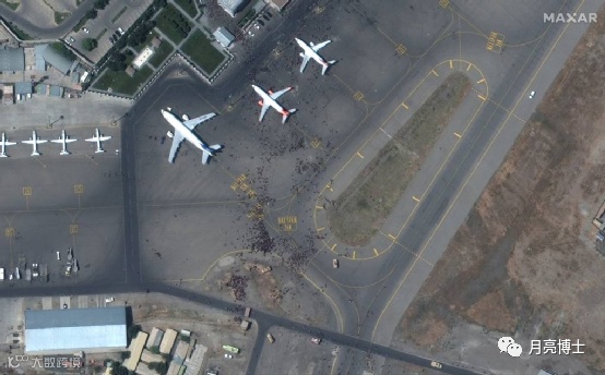 卫星图像显示,当成千上万的人试图离开该国时,人群聚集在阿富汗哈米德卡尔扎伊国际机场的停机坪上。(由 Maxar Technologies 提供)