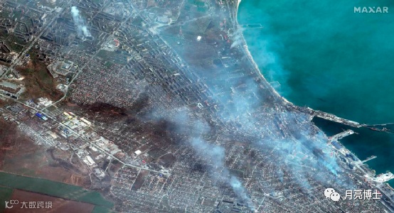 这张由 Maxar Technologies 提供的卫星图像显示了乌克兰马里乌波尔西部起火的港口设施和建筑物。周三,国家侦察局授予该公司三份为期 10 年的商业卫星图像合同之一,作为其电光商业层计划的一部分。(卫星图像 ©2022 Maxar Technologies,通过 AP,文件)