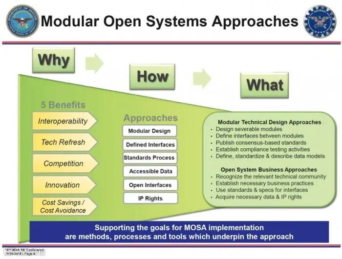 MOSA现在是国防部实施开放系统的首选方法,也是美国法律要求的。美国联邦法典第10编第2446A(B)节第805节规定,所有主要的国防采购计划(MDAP)都将使用MOSA进行设计和开发。