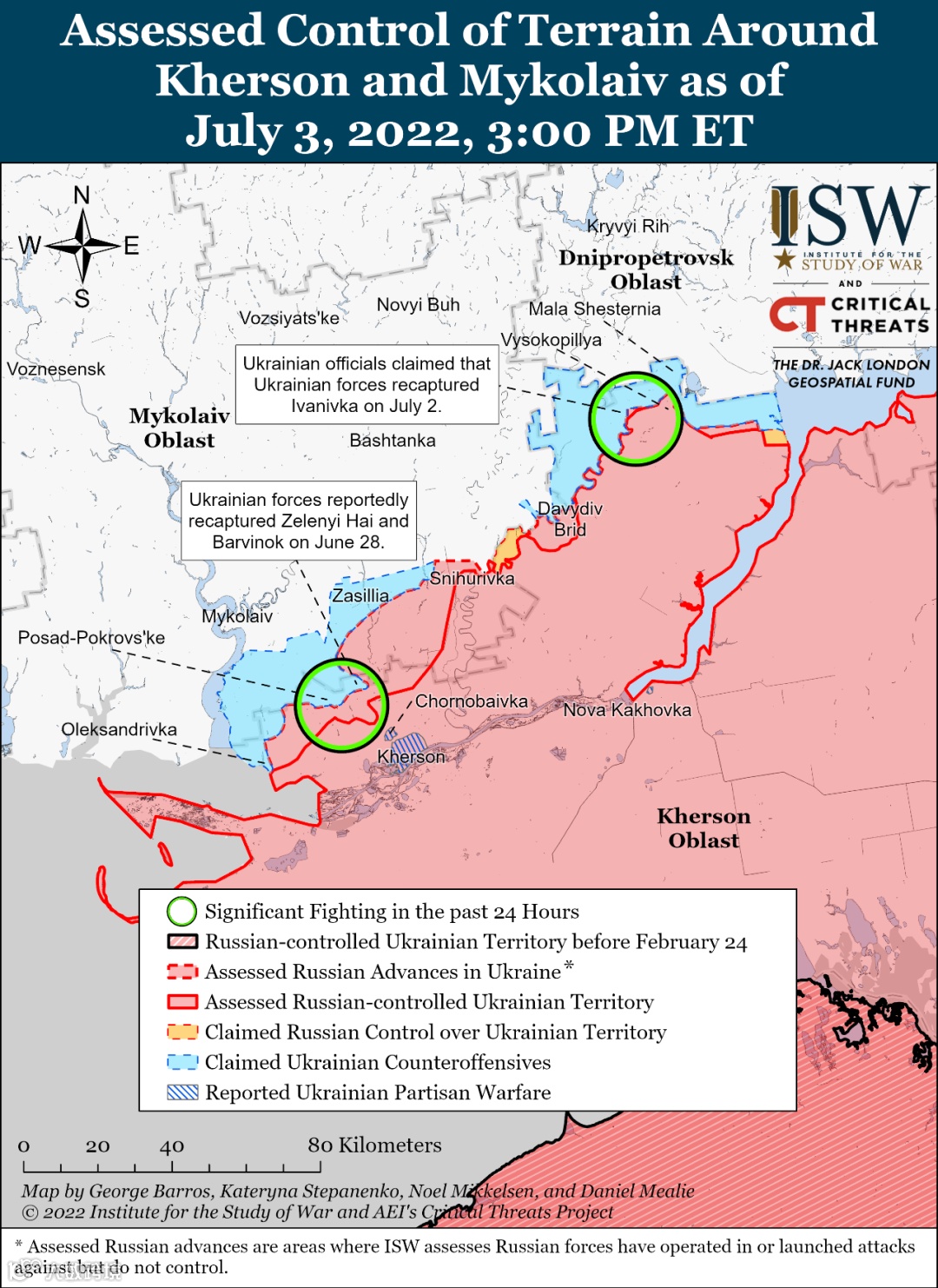 据报道,截至 7 月 2 日,乌克兰作战航空兵仍在赫尔松州活跃。乌克兰南部作战司令部报告称,乌克兰固定翼和旋翼飞机对俄罗斯弹药库和部队集中进行了五次袭击,并声称摧毁了位于 Chornobayivka 和 Snihurivka 的两个俄罗斯弹药库. [29] 俄罗斯军队于 7 月 2 日至 3 日继续对赫尔松州和尼古拉耶夫州进行导弹袭击。[30]