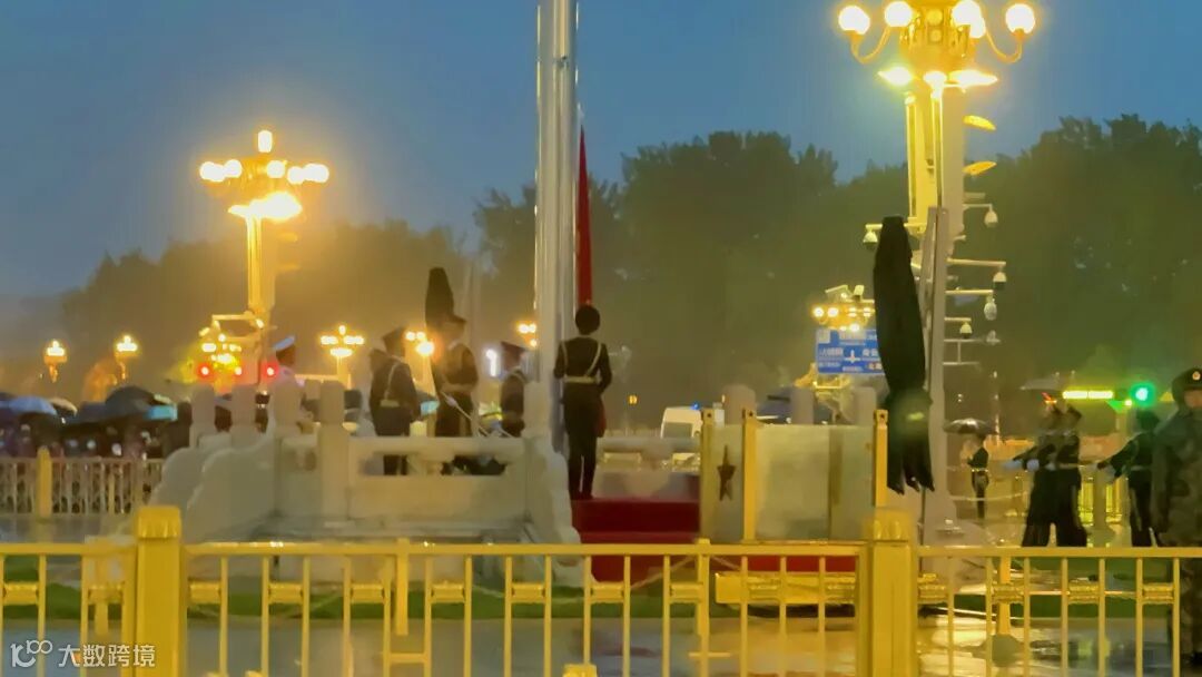 夜色渐消,曙光初现,五点二十八分国旗护卫队员们着装整齐、迈着矫健铿锵的步伐,护卫着鲜艳的五星红旗入场举行升国旗仪式。伴随着第一缕曙光,《义勇军进行曲》奏响,国旗飘扬,青年们整齐站立于天安门东侧观礼台,凝神静气,注目行礼。两分七秒后,国旗准时到达旗杆顶端,飘扬在天安门广场。
