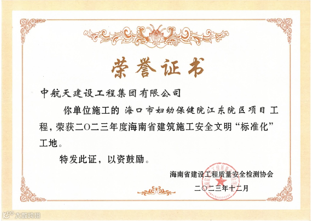 近日,中航天建设工程集团有限公司三公司海口市妇幼保健院江东院区项目荣获2023年度海南省建筑施工安全文明“标准化”工地称号,该奖项是中航天集团在海南的首个安全文明工地类奖项。