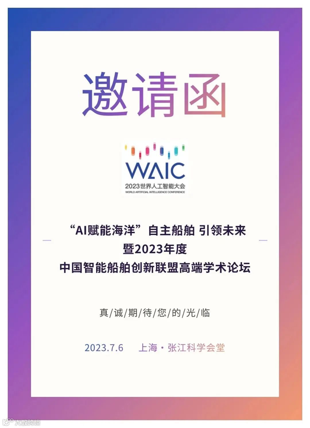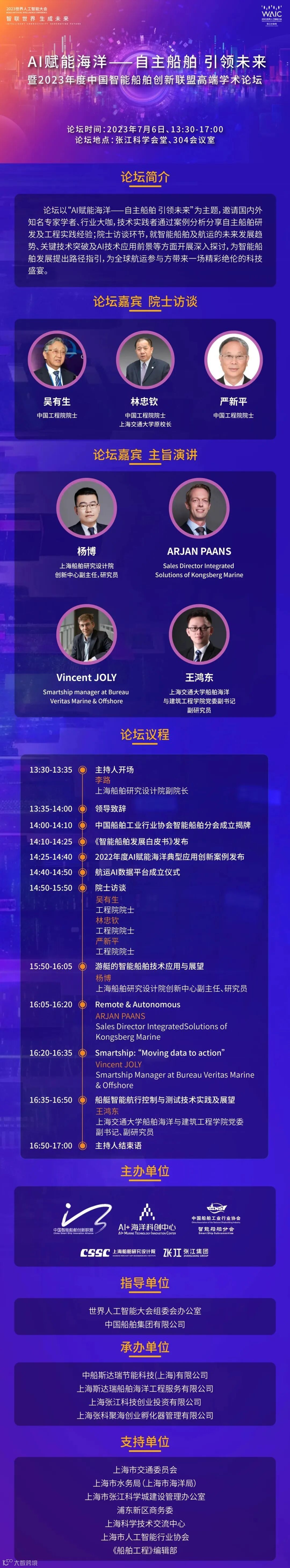 期间,中国船舶集团上海船舶研究设计院、上海张江(集团)有限公司、中国智能船舶创新联盟、AI+海洋科创中心和中国船舶工业行业协会智能船舶分会将联合主办 “AI赋能海洋”自主船舶·引领未来暨2023年度中国智能船舶创新联盟高端学术论坛 。