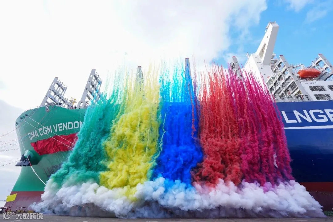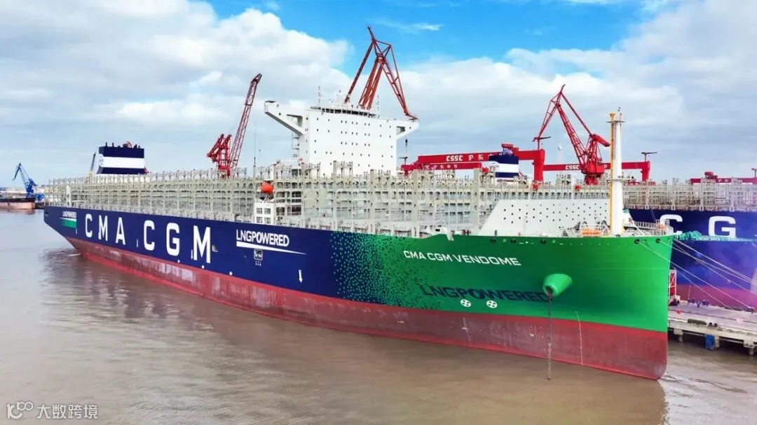 “达飞 旺多姆”号总长399米,装箱量相当于480列中欧专列的总和。该船搭载的18600立方米MARK Ⅲ型LNG燃料舱,可提供近2万海里的清洁动力续航。
