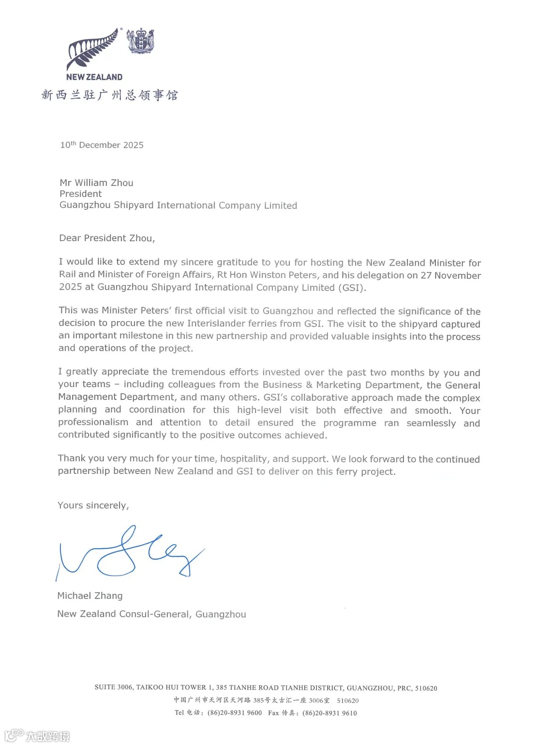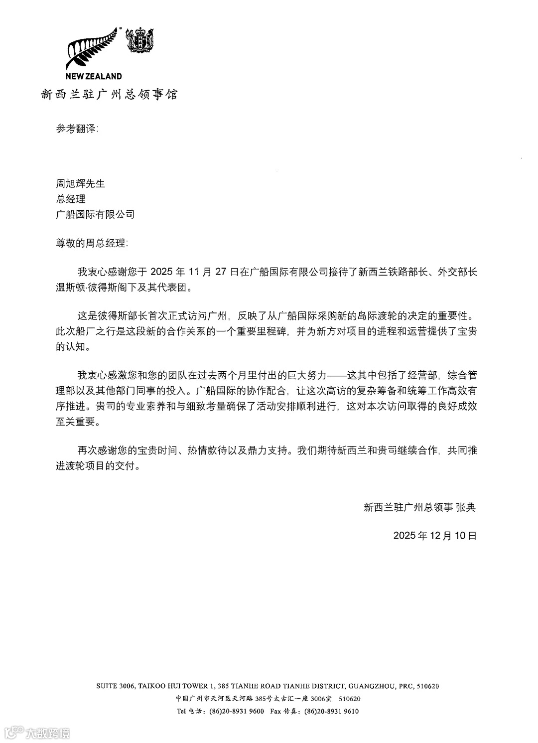12月10日,新西兰驻广州总领事张典(Michael Zhang)致信中船广船国际,衷心感谢广船国际于11月27日热情接待新西兰外交部兼铁道部部长温斯顿·彼得斯(Winston Peters)一行。