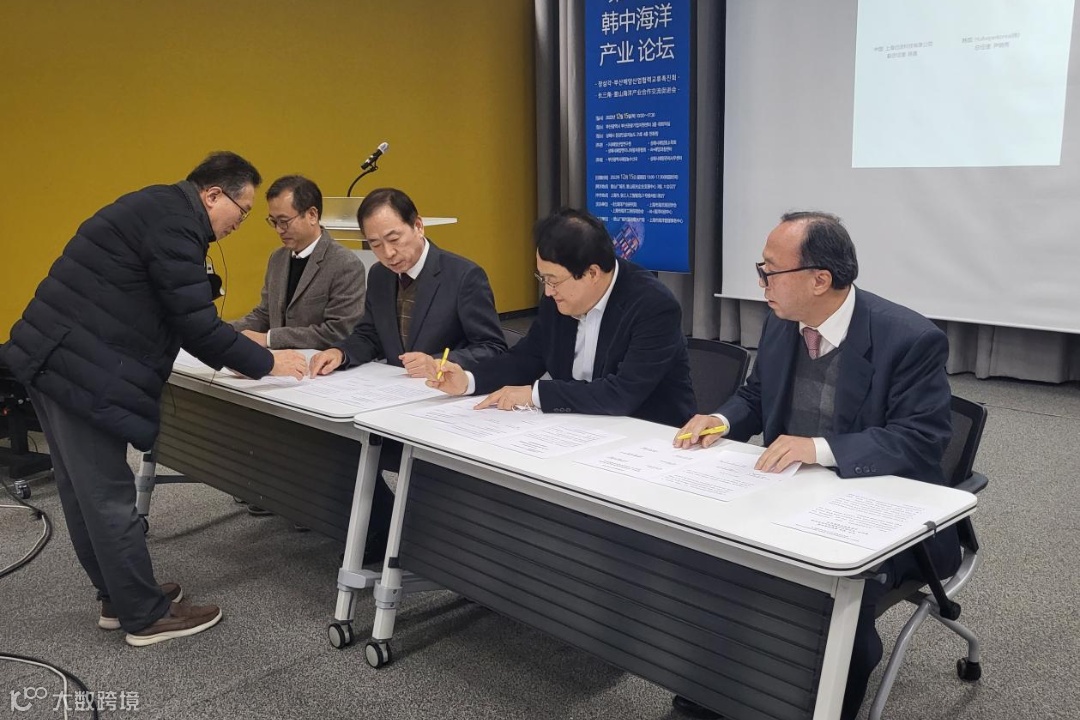 企业交流结束后,上海市海洋湖沼学会、上海市海洋工程咨询协会与海洋产业研究院(韩)希望通过上海-釜山海洋研讨会的“长三角-釜山海洋产业合作促进会”所属企业之间的交流与合作,为中国上海、韩国釜山两市经济发展和城市繁荣做出努力,在会上三方机构领导及6位企业代表进行了“长三角-釜山海洋产业合作促进会交流合作意向协定书”签订仪式。